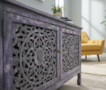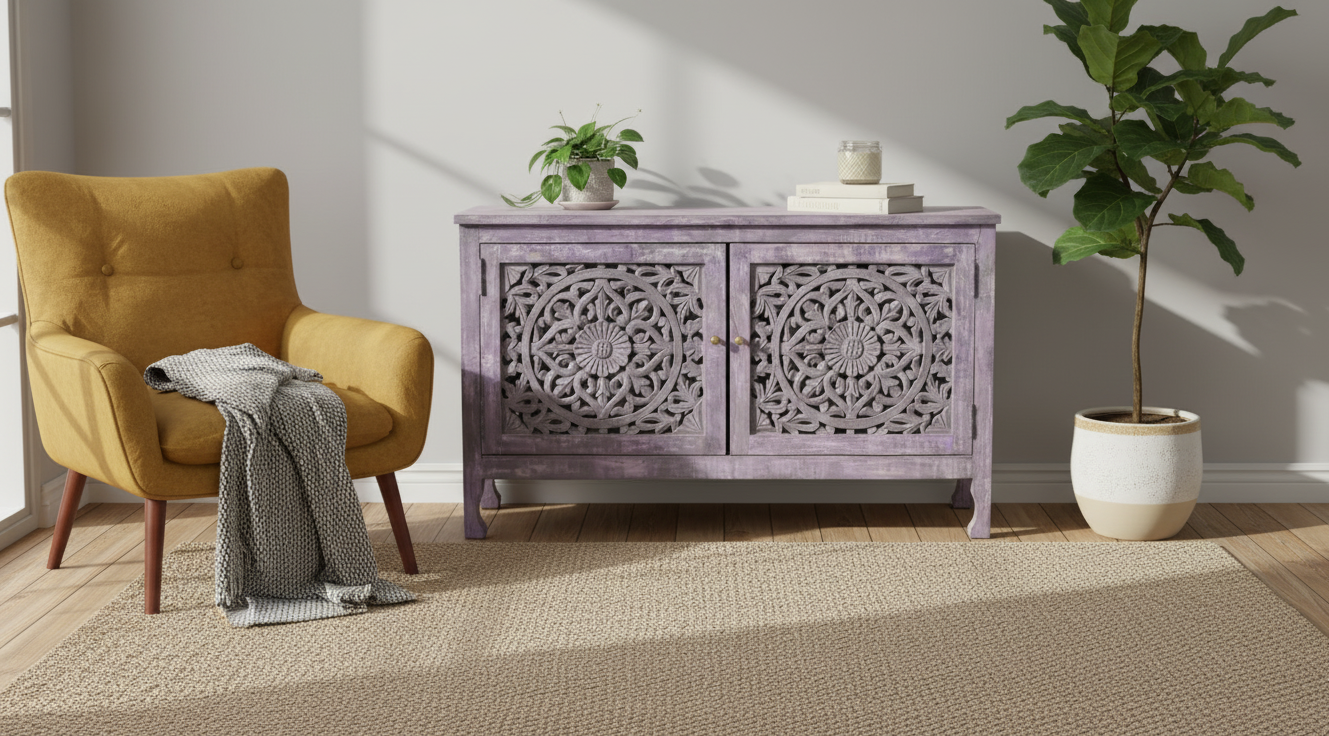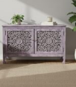 Bring elegance and artistry into your home with our Lavender Bloom Hand-Carved Wooden Cabinet. Expertly crafted from solid wood, this cabinet features intricate floral mandala carvings on its dual doors, showcasing timeless craftsmanship and natural beauty. The soft lavender finish adds a touch of serenity and charm, making it a perfect accent for modern, bohemian, or vintage-inspired interiors. With ample storage space inside, it’s as practical as it is beautiful — ideal for your living room, hallway, or bedroom décor.