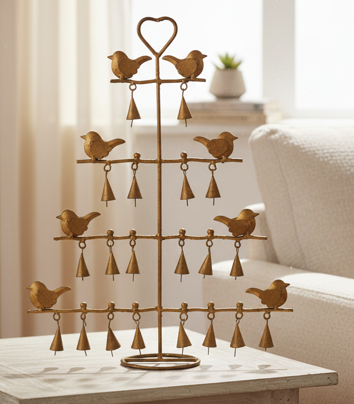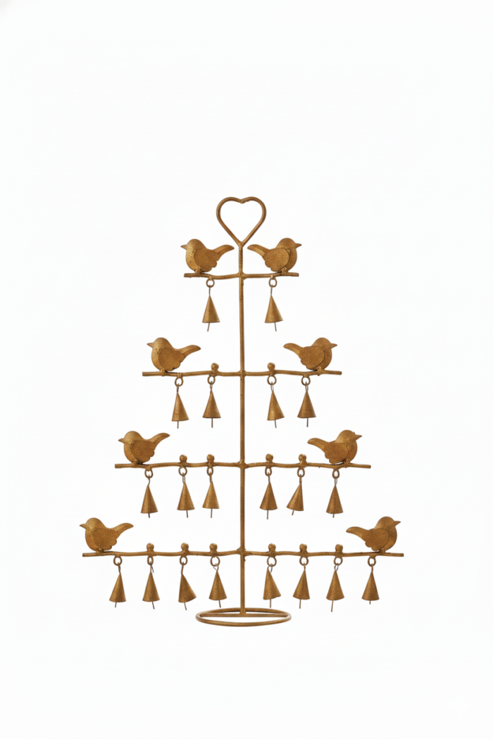 Add a charming rustic touch to your home with this Handcrafted Bird Bell Tree. Expertly made from durable metal, this unique decor piece features adorable bird motifs perched on tree-like branches with hanging mini bells that create a soothing chime. Perfect as a table centerpiece, wall shelf accent, or Christmas decoration, it brings a warm, vintage vibe to any space. Ideal for living rooms, balconies, or entryways, this elegant metal art makes a thoughtful gift for nature and decor lovers.