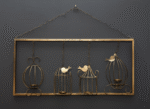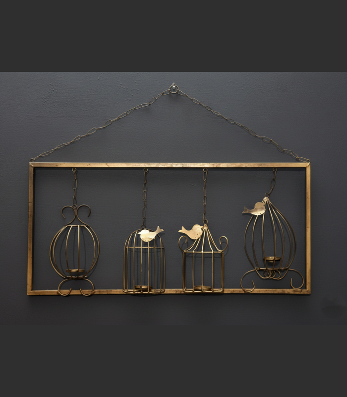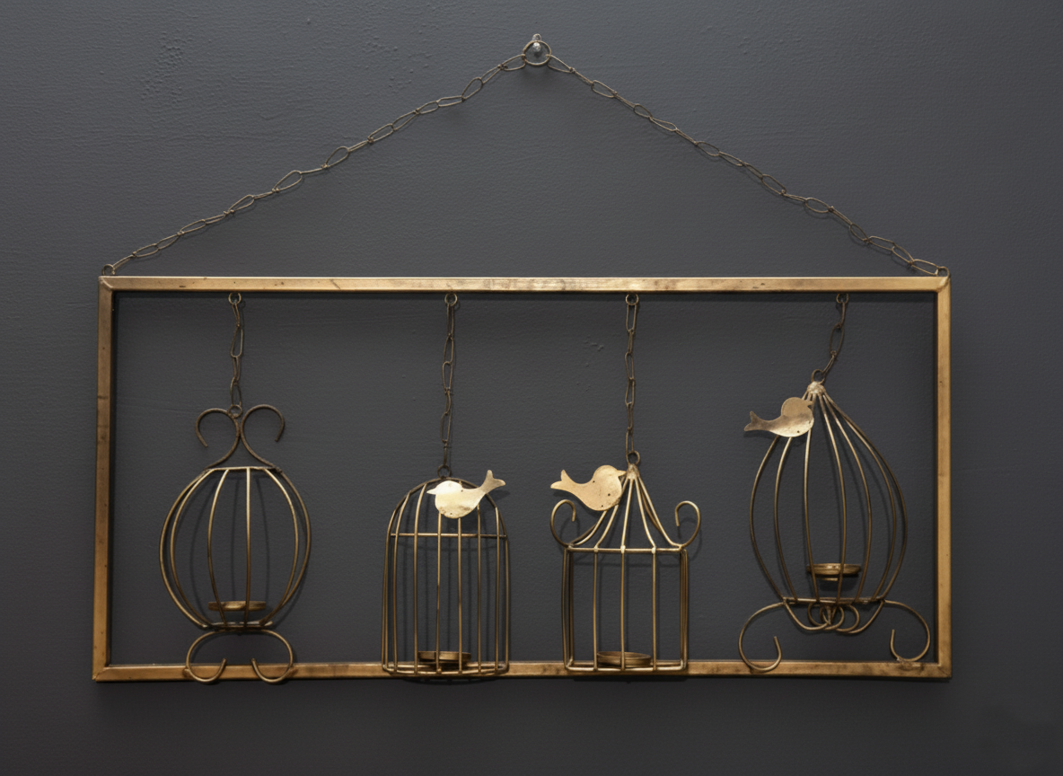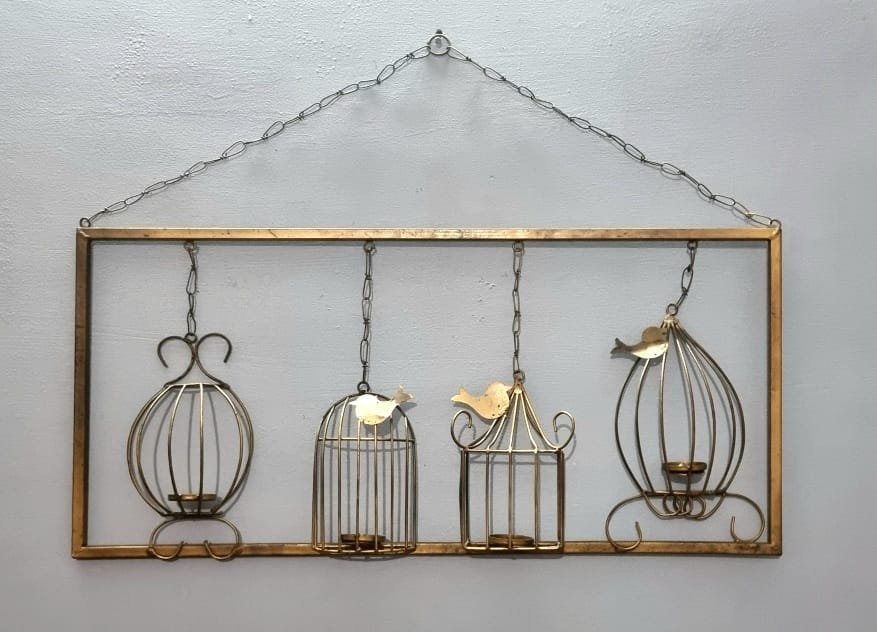 - Birdcages: Suspended inside the frame are four individual miniature birdcages. Each cage is constructed from thin wire, is open-bottomed, and is slightly different in shape (a mix of rounded, cylindrical, and conical designs), adding visual interest.